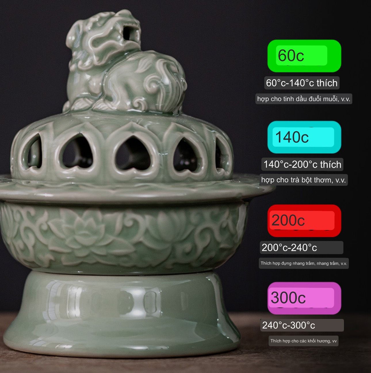 - Lò đốt với kiểu dáng sang trọng, gọn nhẹ phù hợp với phòng khách, cửa hàng, khách sạn sang trọng hay nơi linh thiêng như bàn thờ tổ tiên. Sẵn sàng đánh bay các mùi khó chịu do thời tiết như ẩm mốc hay do khói thuốc. Một bàn uống trà với lư gốm xông trầm bên cạnh sẽ khiến cho thú vui tao nhã lên gấp bộn phần. Ngoài ra, đặt ở bàn tiếp tân của những khách sạn lớn hay quầy spa sẽ khiến khách hàng cảm thấy thật thoải mái, gây ấn tượng sâu sắc khi họ đến nơi thư giãn của bạn.