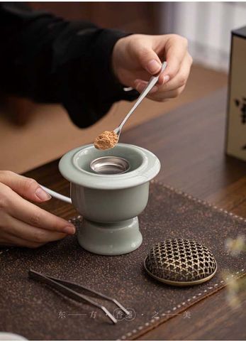 Phụ kiện đi kèm: Khay kim loại, thìa để xúc bột trầm, nhíp để mở nắp lò lúc nóng hoặc gắp.
