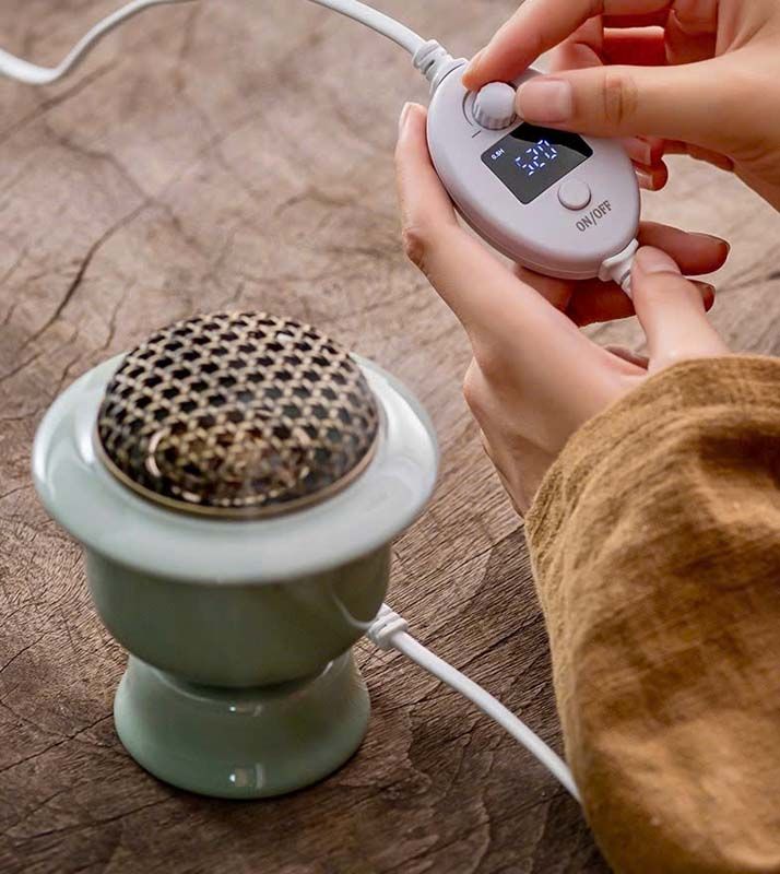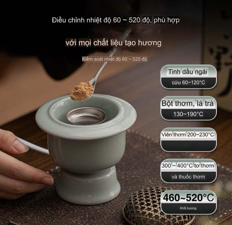 Bước 4: Chỉnh nhiệt độ hợp lý (tinh dầu tầm 100 độ, bột trầm thì tầm 140-170 độ, nụ trầm có thể tầm 180-200 độ). Khi thấy mùi thơm đã lan tỏa thì có thể giảm bớt để duy trì chứ không nhất thiết phải để ở nhiệt độ cao như ban đầu.