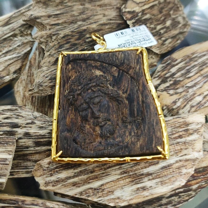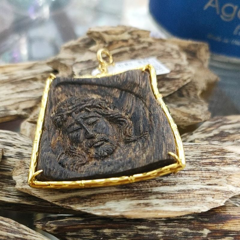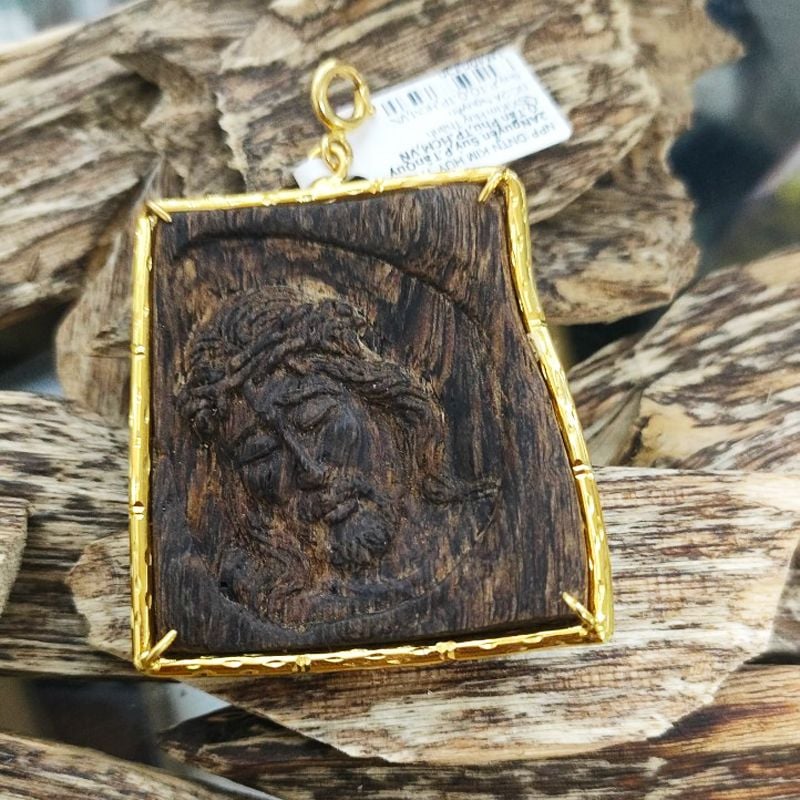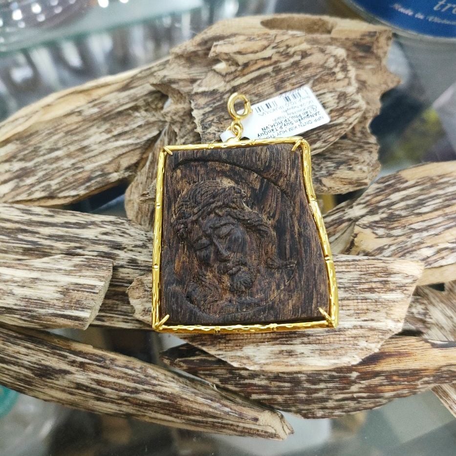 - Mặt trầm là miếng trầm tự nhiên, trầm rừng Philiipine hàm lượng trầm cao, chìm nước, được bọc vàng 18 K điêu khắc tay sắc nét gương mặt Chúa Giêsu