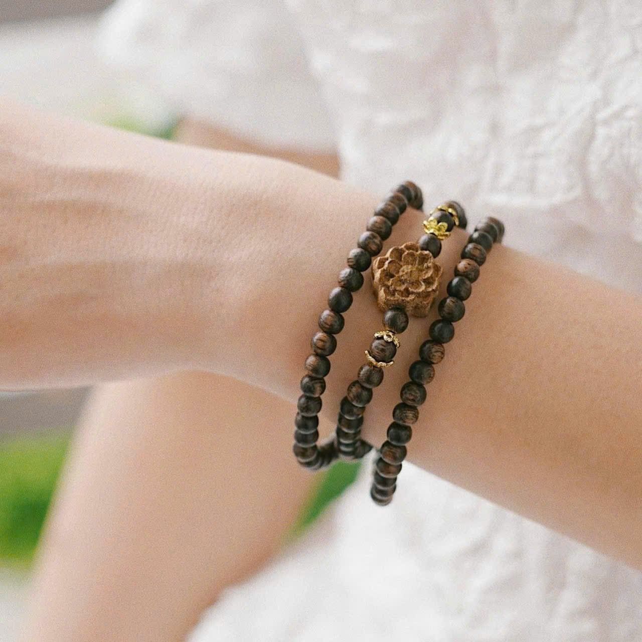 Vòng Trầm Hương Indo 4mm Mix Hoa Sen Quấn 3 Vòng Dành Cho Nữ – VHT20251225